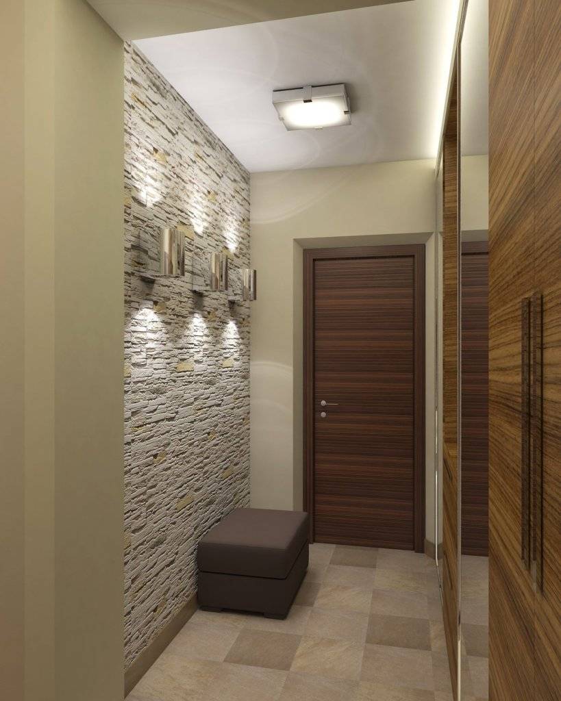 Визуально расширить длинное пространство прихожей помогут потолочные споты, расположенные вдоль стен. Заменой (дополнением) спотов служит светодиодная лента, проложенная в стиле взлетной полосы. Подсветка зеркал и других предметов декора также зрительно расширит прихожую.