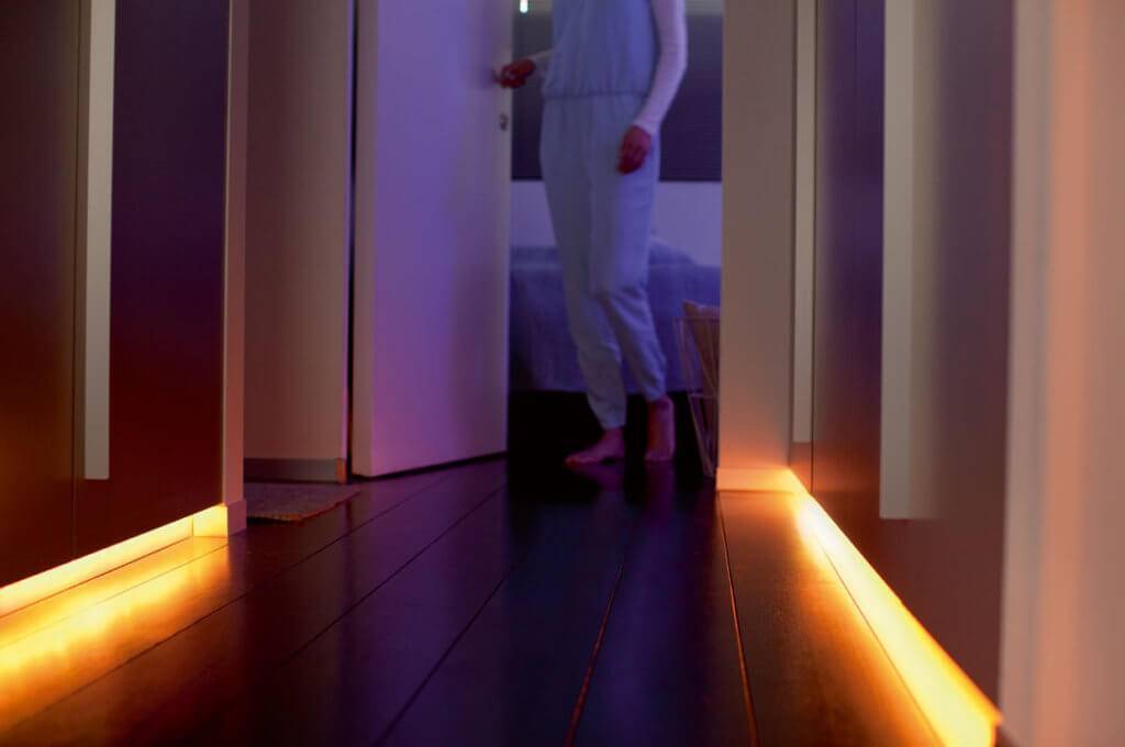 Для подсветки и обозначения направления подойдет светодиодная лента, встроенная в плинтус.