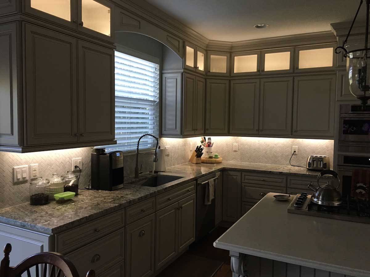 Над верхними шкафами, если помещение имеет достаточную высоту. Свет, направленный в потолок, сделает помещение зрительно выше