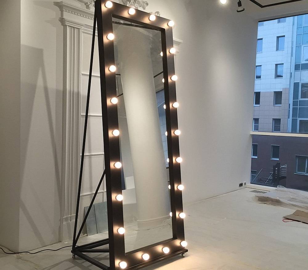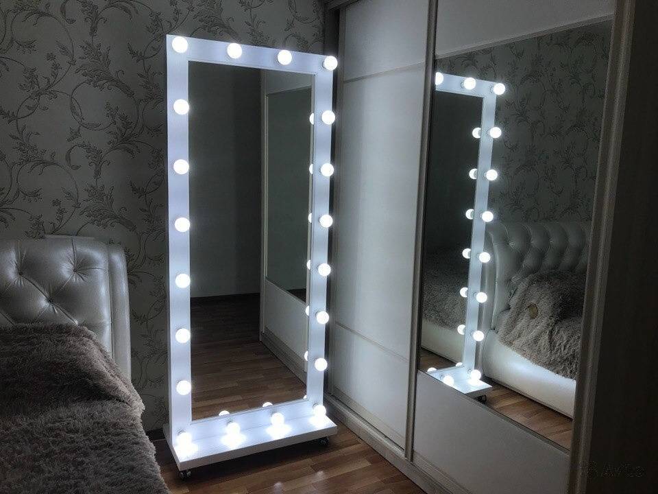 Для того чтобы иметь возможность рассмотреть себя в полный рост, нужно выбирать большое напольное зеркало. При необходимости конструкцию можно вращать или переставлять с одного места на другое. Единственное, что нужно учитывать при этом — длину электрического провода.