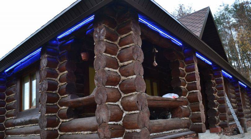 Подсветка скрытого типа — это освещение, создаваемое при помощи встроенных в фасад дома светодиодных лент. Такой тип выгодно и красиво подчеркивает очертания дома.