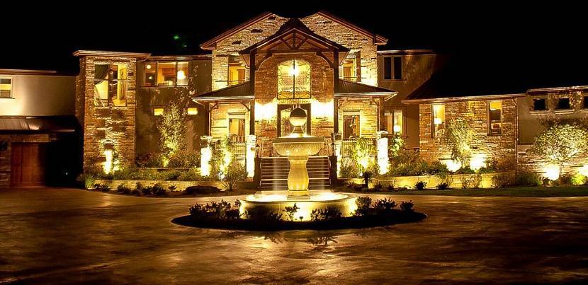 - Перед тем как сделать красивую подсветку, понадобится правильным образом разместить прожекторные установки на участке. Осветительные системы будут проливать свет на поверхность здания с нескольких сторон.