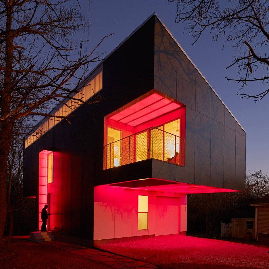 Скрытое освещение. Может быть представлено силуэтной подсветкой (выделяются очертания здания на темном фоне), контурной ( подсвечиваются контуры крыши, оконные проемы, входная группа) или же динамическим освещением (возможность управления цветом свечения, яркостью и даже направлением светового потока)