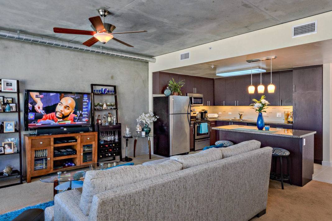Потолочное освещение может использоваться для разделения общего пространства, плавно переходящего в гостиную зону