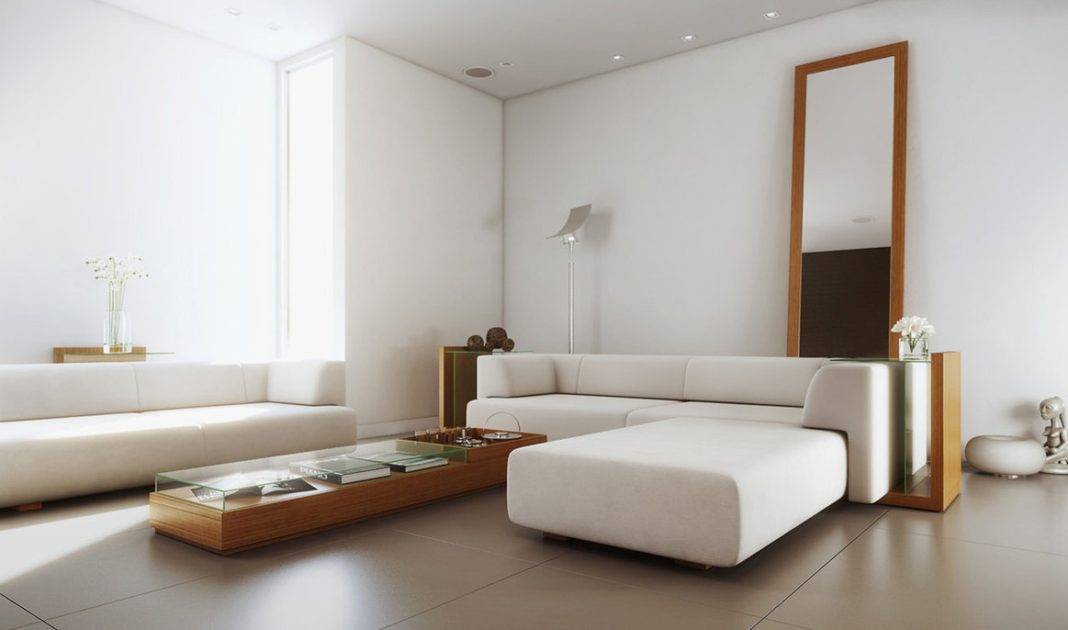 Этому стилю присуще ограниченное количество предметов мебели и полное отсутствие декора. К характерным цветам относится белый, серый, черный, светло-коричневый. Контрастных сочетаний лучше избегать. Встроенная мебель, шкафы-купе на всю стену со стеклянными дверями и модульная система со стальными вставками — заменят традиционную стенку. Достаточно 2-3 модулей для размещения вещей, например: тумба под телевизор, подставка для книг или дисков и навесной шкаф или полка. Мягкая мебель простой прямоугольной формы, с однотонной обивкой или скромным орнаментом.