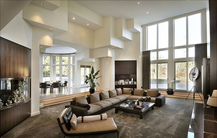 Такой гостиной присущи строгость, четкость линий, присутствие стекла и металла в интерьере, блеск и некоторая холодность при минимальном количестве аксессуаров. Современные технологии, например, музыкальный центр или домашний кинотеатр, станут главным украшением такого дизайна. Оживить гостиную помогут яркие детали в виде букета цветов, ярких подушек или интересной вазы.