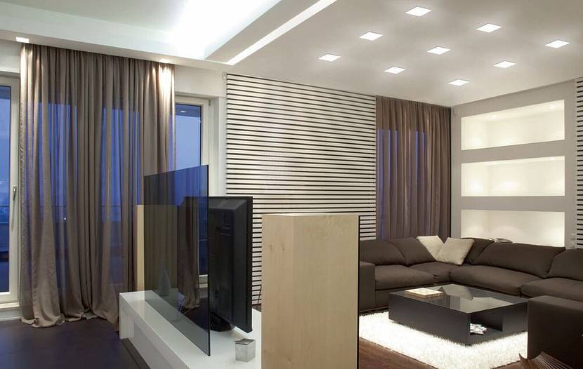 Современная квартира, в которой установлены натяжные потолки с точечной подсветкой и диодной лентой – другие нормы. Можно обойтись без люстры, но ее отсутствие компенсируют бра, мебельной подсветкой и другими видами локального (местного) освещения функциональных зон.