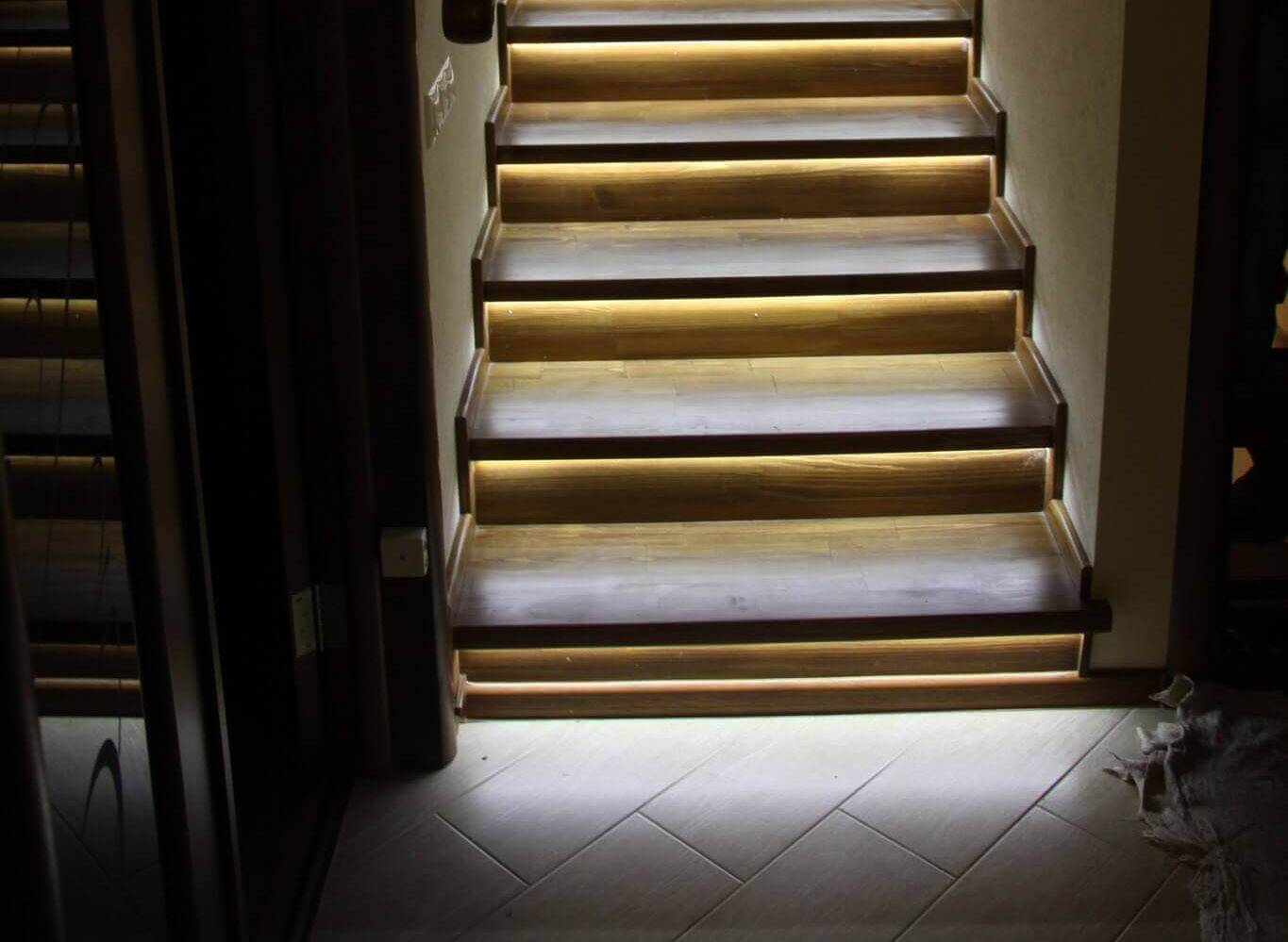 Подсветка ступенек лестницы может выполняться светодиодными, неоновыми или другими видами осветительных приборов, которые ставятся по ширине и длине ступенек, по их углам и краям, над лестницей на потолке. Если монтируется подсветка ступеней лестницы, светильники нужно устанавливать так, чтобы свет от приборов не искажал в ночное время размеры и форму ступенек, не отбрасывал тень, иначе человек, идущий по ним, может просто оступиться.