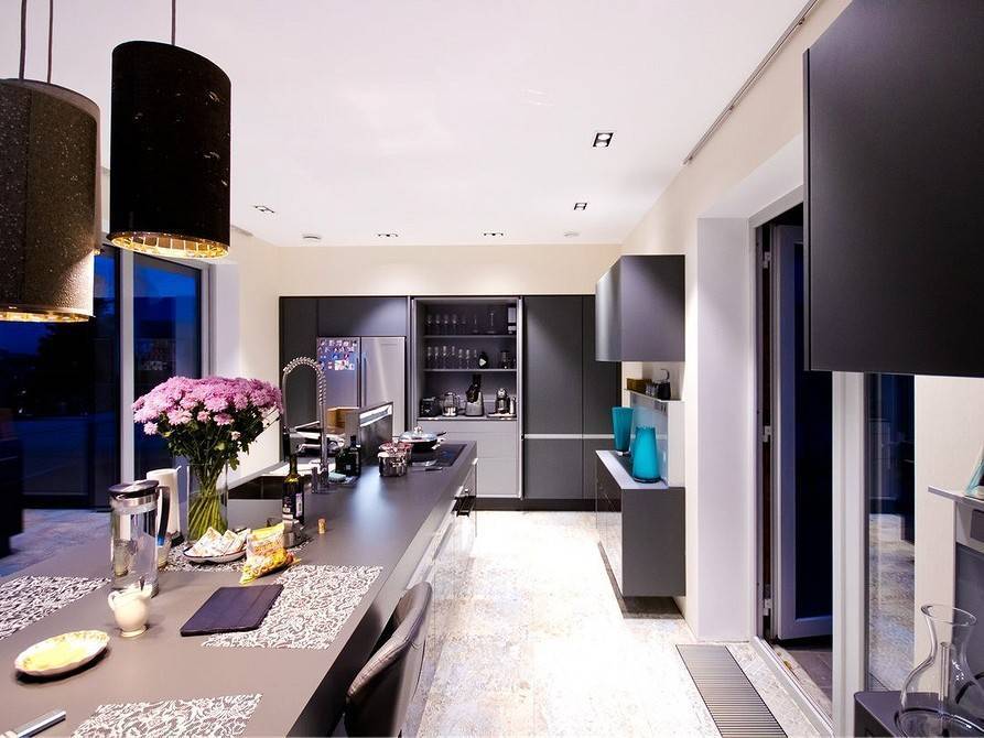 Потолочное освещение должно быть ненавязчивым, равномерным, мягким, но в то же время ярким. Кухню-гостиную с невысокими потолками лучше осветить накладными или встроенными светильниками, с высокими – лампами на длинных шнурках.