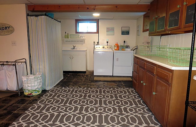 В цокольном этаже рядом с кладовой, мастерской или гаражом часто выделяют место для прачечной и сушилки (в зимнее время), что очень удобно и экономит время хозяйки. Это же помещение используют для купания. Таким образом, вернувшийся с работы человек, не заходя в основные помещения, может принять душ или ванну.