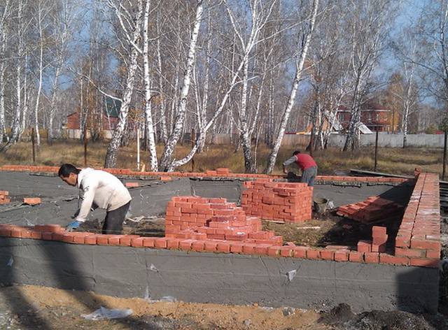 Нижнюю кирпичную прослойку, которая располагается прямо на фундаменте, тоже необходимо защитить от влажности. Для этого под первый ряд кирпичей следует подстелить рубероид. Лучше всего сделать 2 таких слоя.