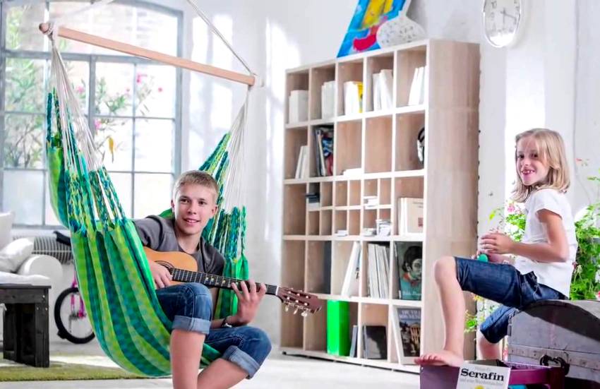 Дети будут в восторге от расположения модернизированного гамака рядом с игровой зоной или спортивной площадкой, обустроенной на улице. Мягко оформленные «воздушные» кресла-качели способствуют долговременному нахождению детей на свежем воздухе.