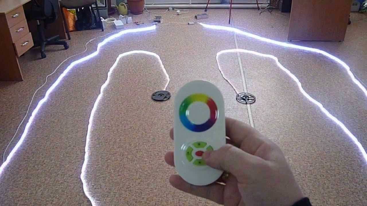 Уже упоминалось, что есть ленты, которые выдают подсветку разноцветную (RGB). В данном случае, кроме трансформатора есть необходимость в контроллере, для того, чтобы можно было управлять яркостью. Переключение света осуществляется за счет программы.