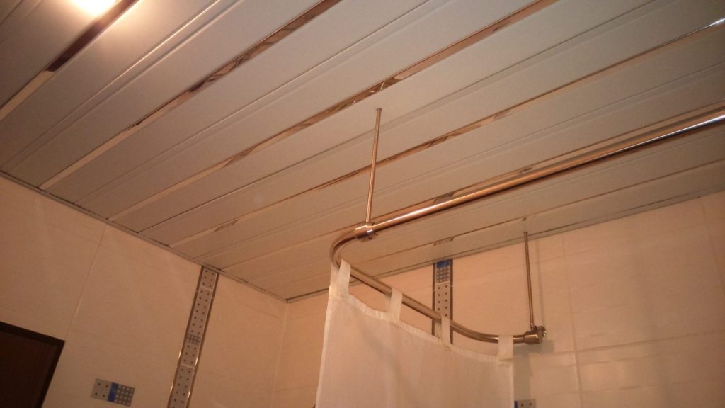 Стальное покрытие потолка прижилось в складских помещениях. Прочность, звукоизоляция, отражение света, дешевизна – важные преимущества материала. Однако склонность стали к ржавчине обязывает обеспечить максимальную сухость в помещении. А вот пластиковые рейки поистине универсальны: их можно применять в условиях сырости, повышенной влажности, они не требуют сверхсложного ухода. Пластик на потолке востребован в одинаковой мере в коммерческих и жилых помещениях, в том числе и в ванной.