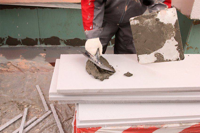 Используют сухие клеевые смеси. Специалисты рекомендуют одновременно покупать и армирующие составы этого же производителя. Они (составы) наносятся на укрепленную поверх ППС сетку, необходимую в том случае, если планируется оштукатуривание фасада или другой вид отделки, для монтажа которого требуется цементно-песчаный раствор.