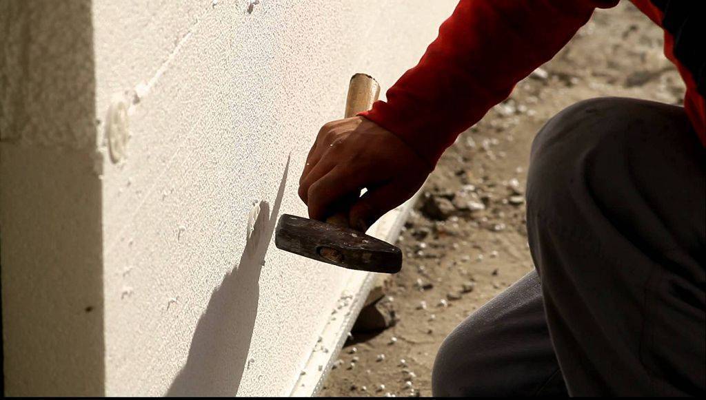 Для этого нужно сделать сквозные отверстия в плите и в газобетоне на 4-5 см по четырем углам и по центру. В целях экономии дюбеля можно крепить на стыках плит. Шляпки нужно «утопить» в пенополистироле.