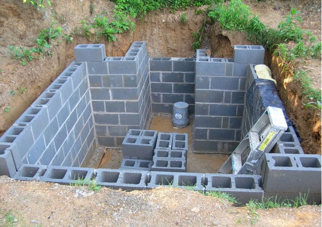 При высоком уровне грунтовых вод сооружаются стены из бетона, кирпича или блоков. Они выкладываются до уровня земли, с внешней стороны укладывается гидроизоляция