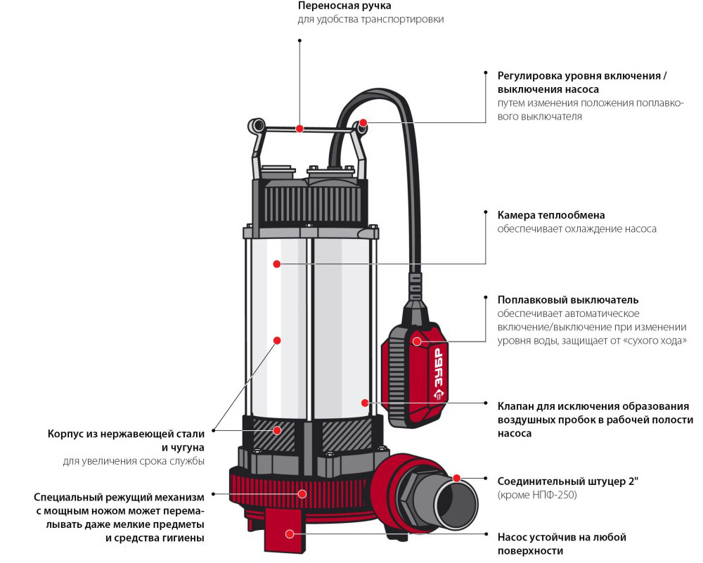 Если же говорить об общем принципе устройства дренажного насоса, то тут стоит выделить такие элементы конструкции.