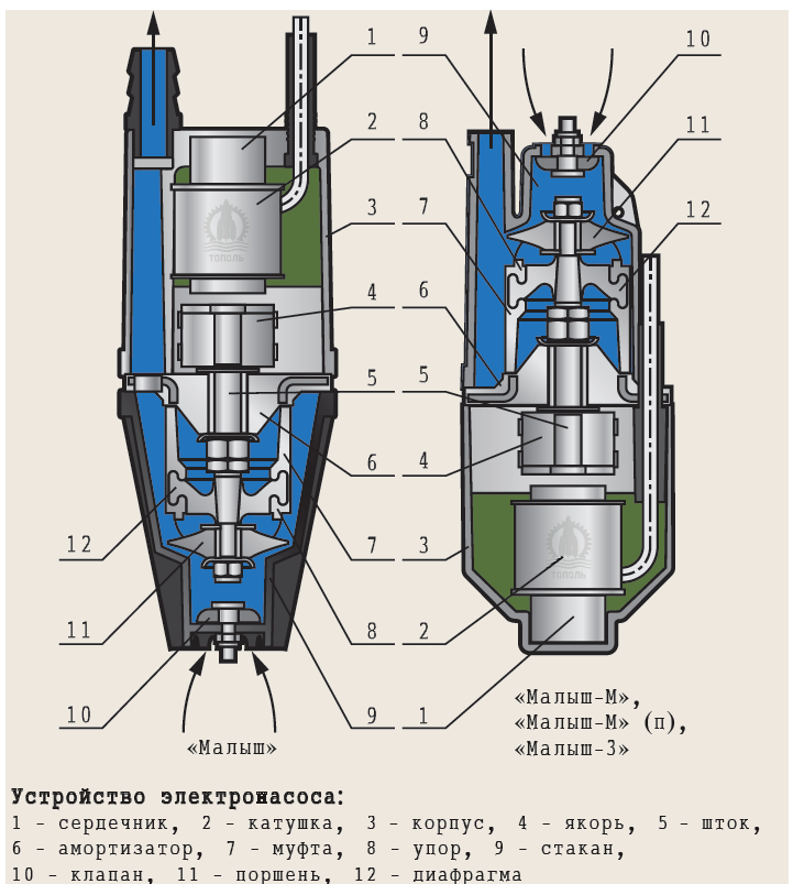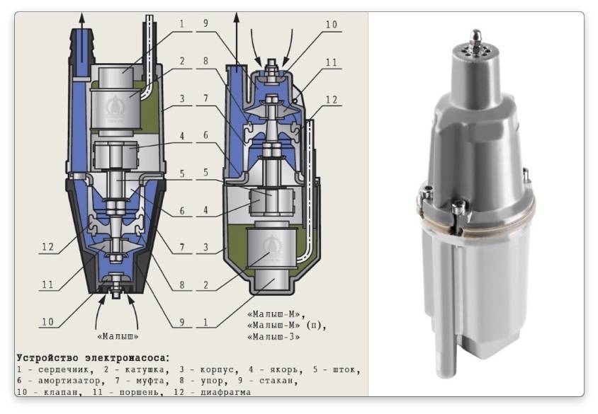 Эти модели вибрационных насосов подходят по ценовой политики и заявленных функциям для бытового использования. Модель “Малыш” работает с минимальным потреблением электроэнергии. Насос способен перекачивать до 430 литров в час. Есть несколько разновидностей этих моделей, которые предназначены для погружения на разную глубину. Максимально вы можете установить погружной вибрационный насос на глубину до 40 метров.