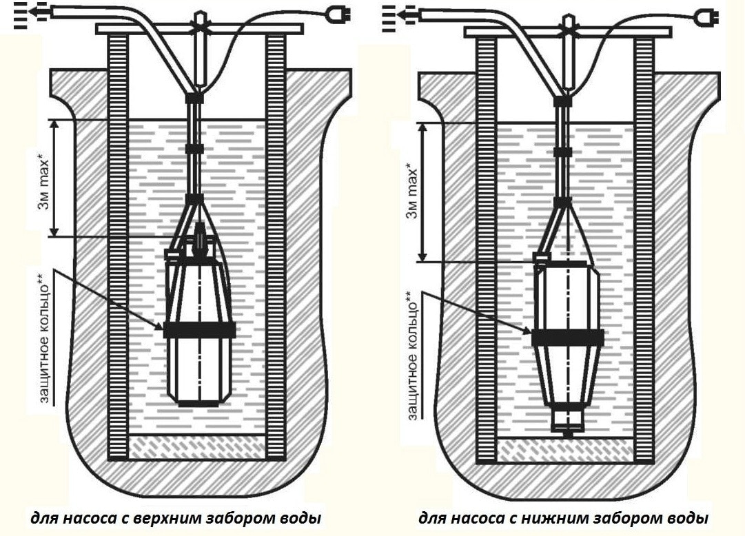 Если насос опускается в скважину, на его корпус, должно быть, надето толстое резиновое кольцо, которое предохранить удары корпуса насоса о стенки обсадной трубы.