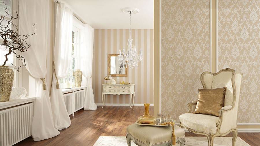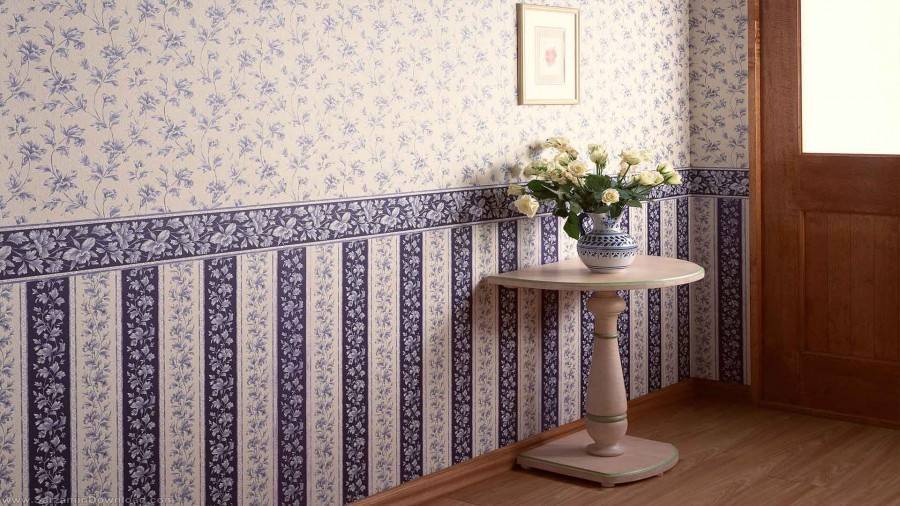- мелкий рисунок и крупные цветы/полосы: стена делится в соотношении 1/3 по высоте. Внизу – однотонные, мелкие узоры, вверху – большие цветочные мотивы, полоски, вензеля;