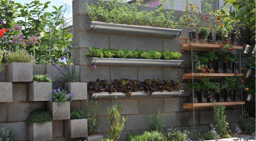 Креативный бетонный забор с разнообразными полками для растений (фото: www.shutterstock.com/ru/g/Sergey+V+Kalyakin)