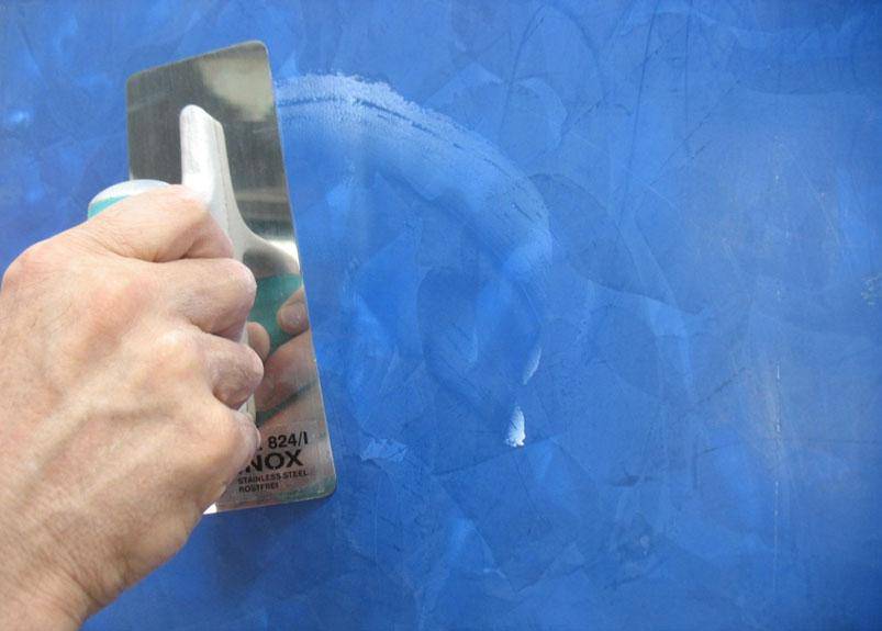 Данная техника является противоположностью сухой кисти. Принцип ее основан на том, что второй слой ЛКП полностью укрывает первый, и затем с выпуклых поверхностей удаляется. В результате проявляется первый слой.