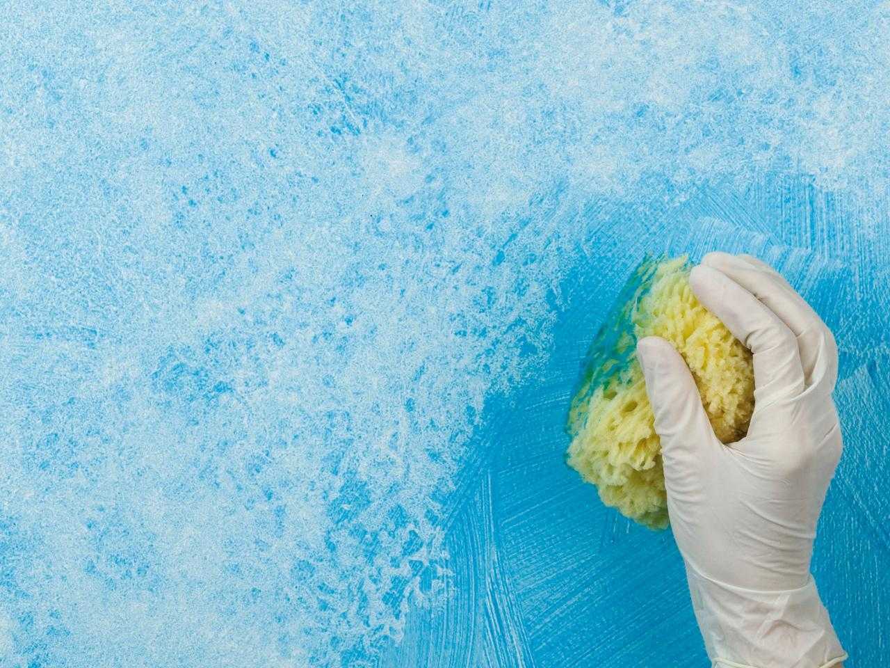 Метод актуален для комнат. Стену красят в один цвет, используя разбавленную краску на воде. Потом ее влажной губкой смывают.
