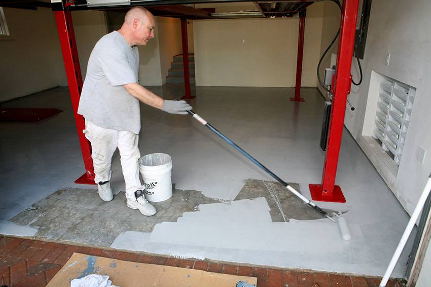 Перед покраской пола в гараже требуется подготовить бетонное основание. Для чего поверхность очищается от пыли и грязи, неровности заделываются шпаклевкой или раствором и только потом наносится краска.