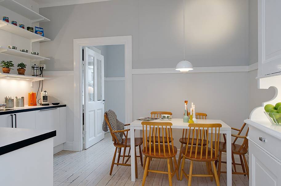 Стены, как правило, окрашиваются в два цвета — карниз в белый, а сама стена в цвет другого оттенка. В кухне, прихожей или ванной комнате стена делится на две части. Нижняя часть (примерно до 1,6 м от уровня пола) окрашивается эмалью, а верхняя — водно-дисперсионной или клеевой краской.