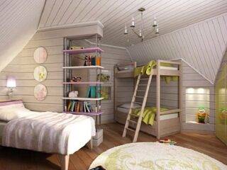 Оригинально смотрится беленая вагонка на потолке, расположенная между темными массивными балками. В спальне, гостиной, детской можно создать эксклюзивное покрытие стен, древесину покрасить любым ярким цветом, расписать узорами.