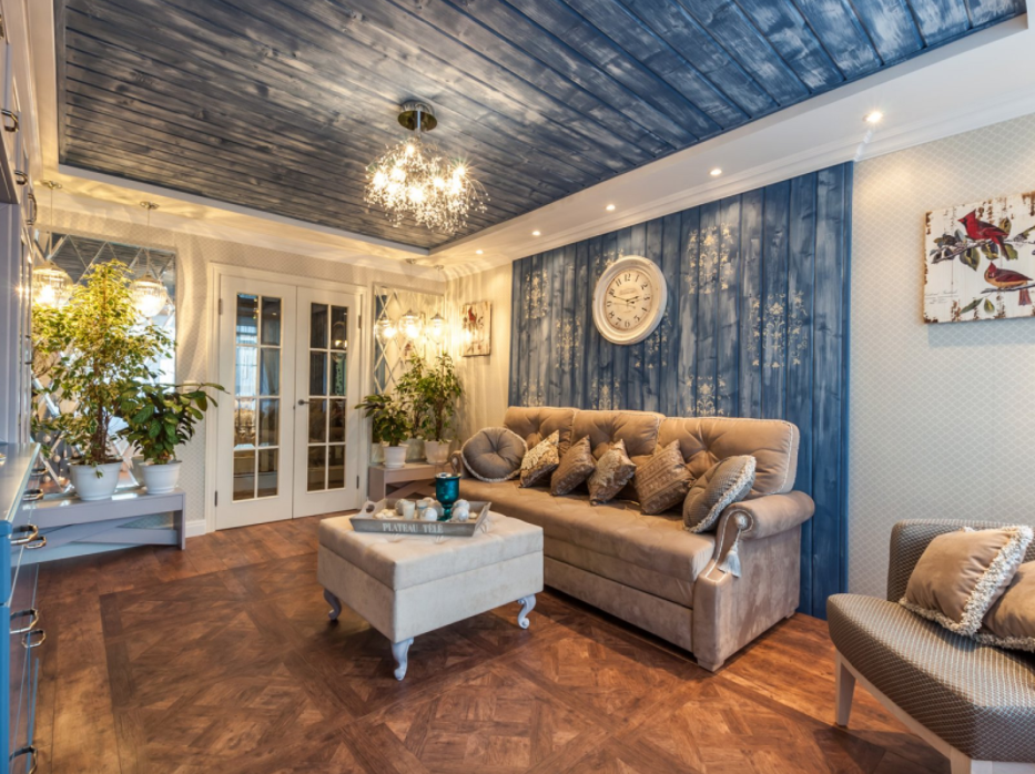 Необычно смотрится комбинирование вагонки разной толщины. Широкий профиль чередуют с тонким и окрашивают. Красят в один цвет, но разной интенсивности. Из ровных профилей и блок-хауса формируют впадины и волны. Зоны освещения выбеливают, оставшиеся просто покрывают прозрачным лаком.
