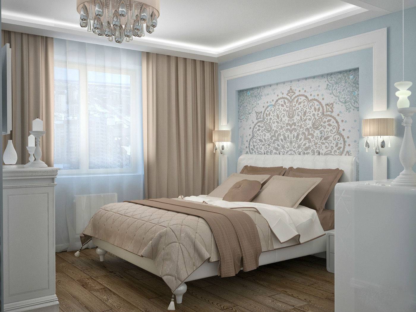 На фото современная спальня в сине-бежевой палитре.