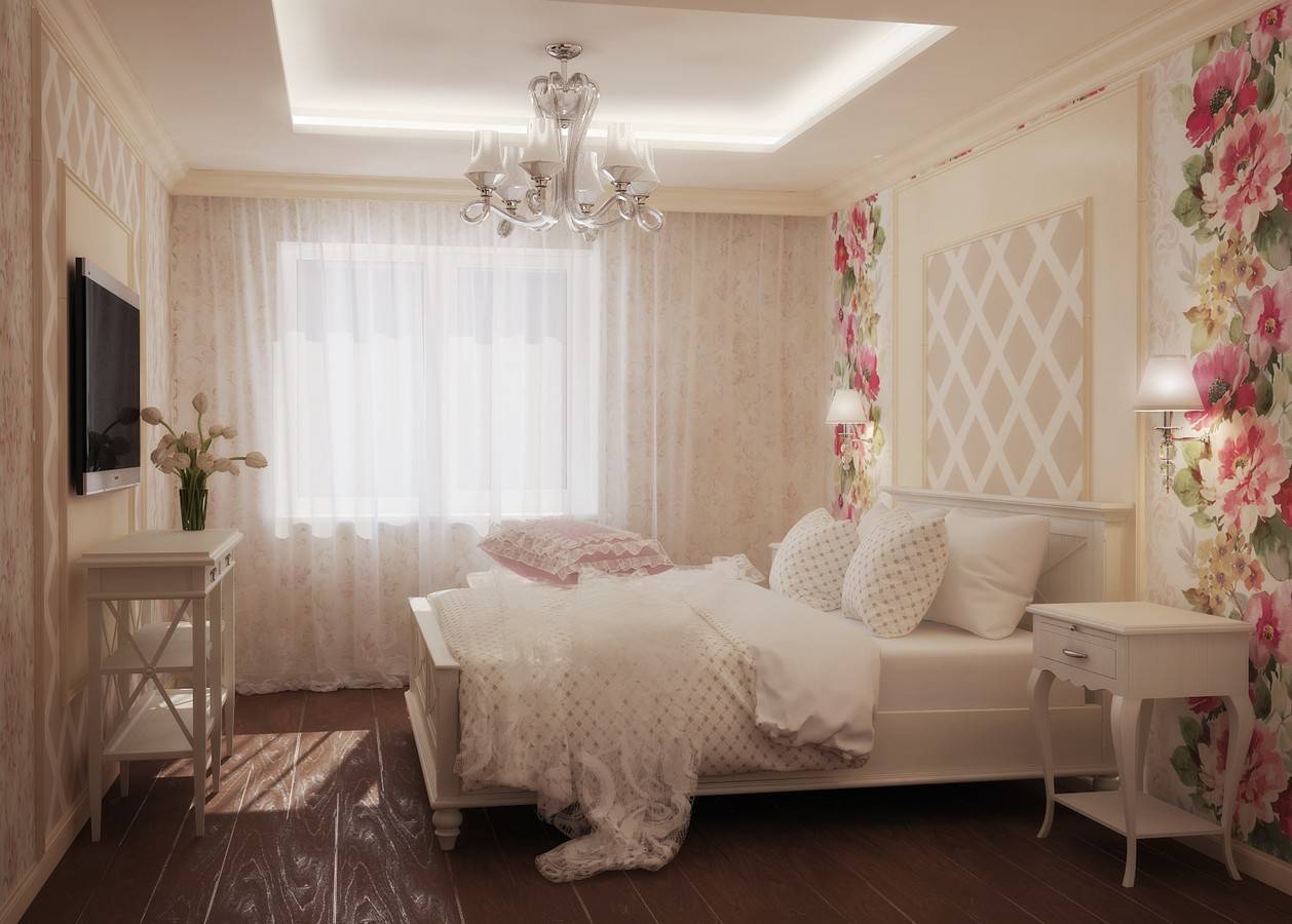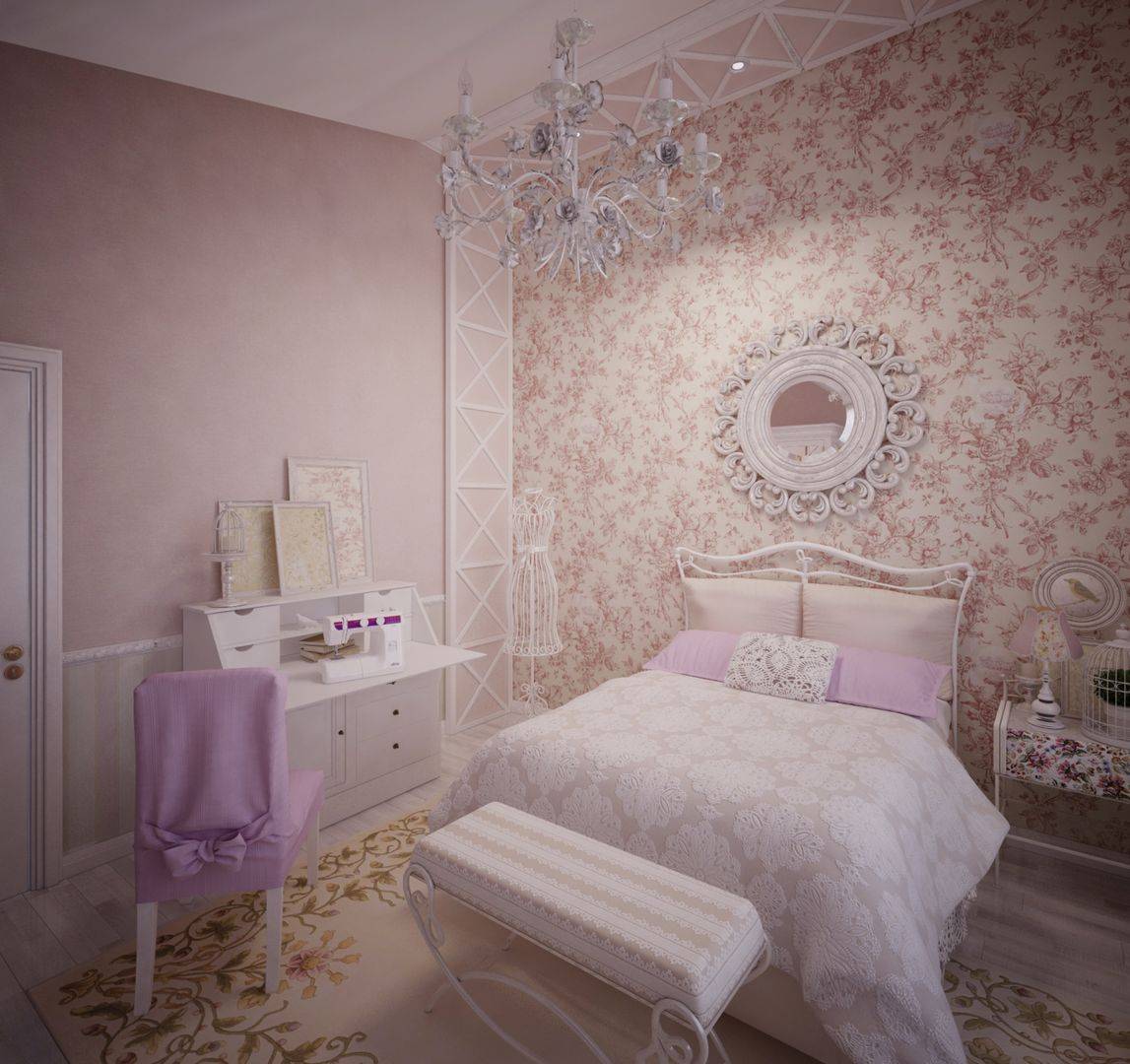 Стиль сочетает в себе нежность, романтичность и уют. Светло-синие обои с мелким цветочным принтом или жидкие обои с эффектом штукатурки станут лучшим интерьерным решением.