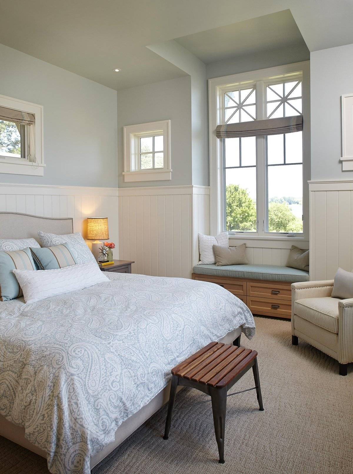 Выбор цветовой гаммы определяется назначением и размером помещения. Для просторной комнаты подходят холодные тона – например, голубой, оливковый, цвет лаванды.