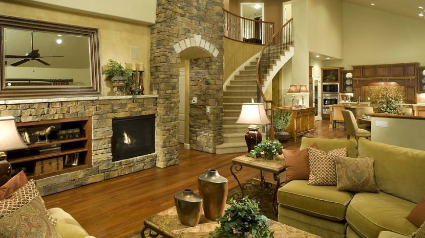 В деревенском стиле предполагает пол из грубой доски или ламината, в условиях квартиры это может быть паркет из темной древесины. Такой пол сочетается с кожаным диваном, потертой мебелью, деревянным столом из сосны или груши.