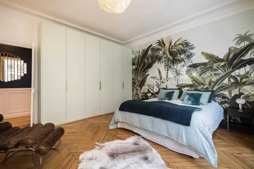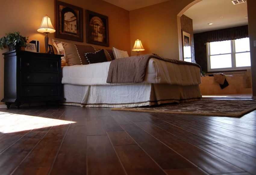 Красивое и дорогое покрытие придаст спальне элегантную роскошь. Паркет долго служит, не теряя своей привлекательности. Он экологичен, обеспечивает неплохую шумо- и звукоизоляцию.