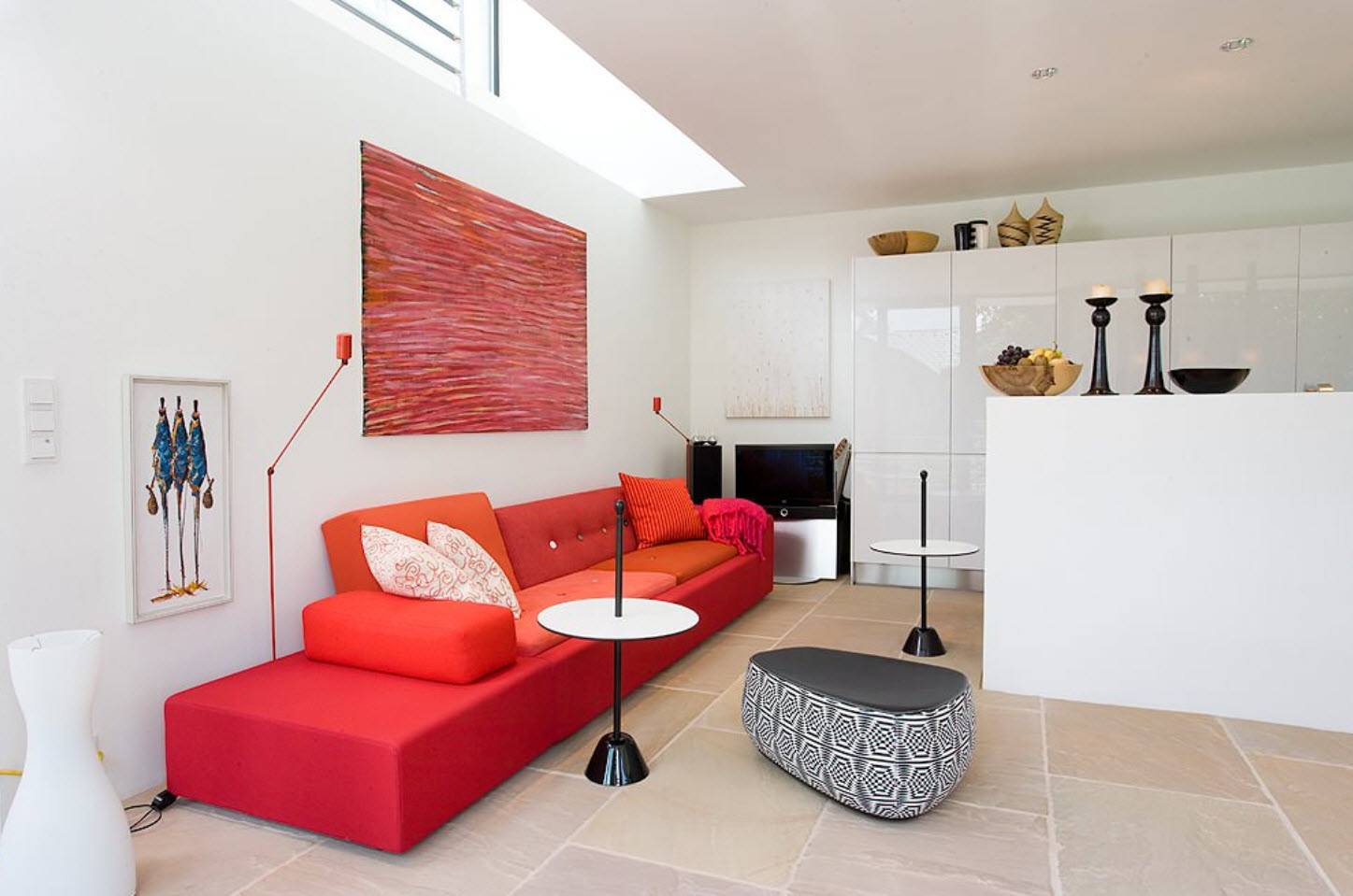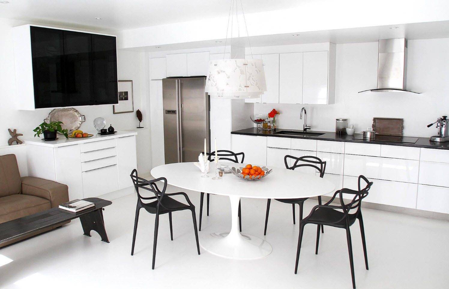Центральную часть занимает гостиная, совмещенная с кухней и столовой. Благодаря открытию жилого помещения к кухонной зоне комната приобретает вместительность, и целое кажется намного большим. Кроме того, вездесущий белый оптически увеличивает небольшое пространство и идеально подходит в качестве фона для более сильных цветовых акцентов. Так, белый хорошо сочетается с деталями из красного. Мебель в этом случае может быть черного цвета.