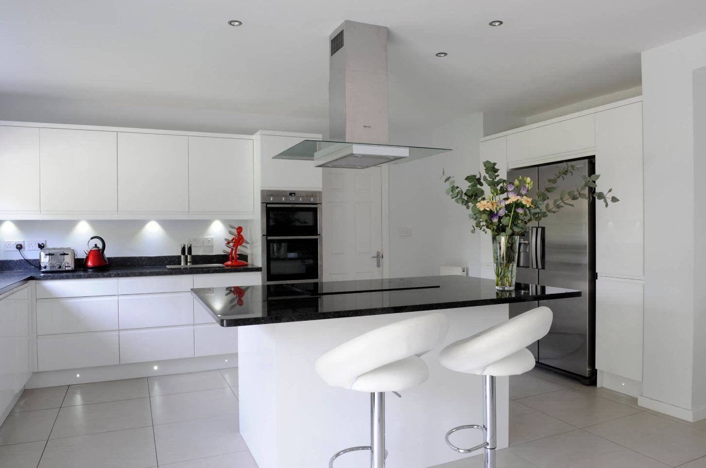 Современные кухни приветствуют ламинированные фасады, которые будут великолепно смотреться в черном цвете. Белые стены станут незаменимой основой, а красный можно добавить в виде ненавязчивых акцентов кухонной техники или живых цветов.