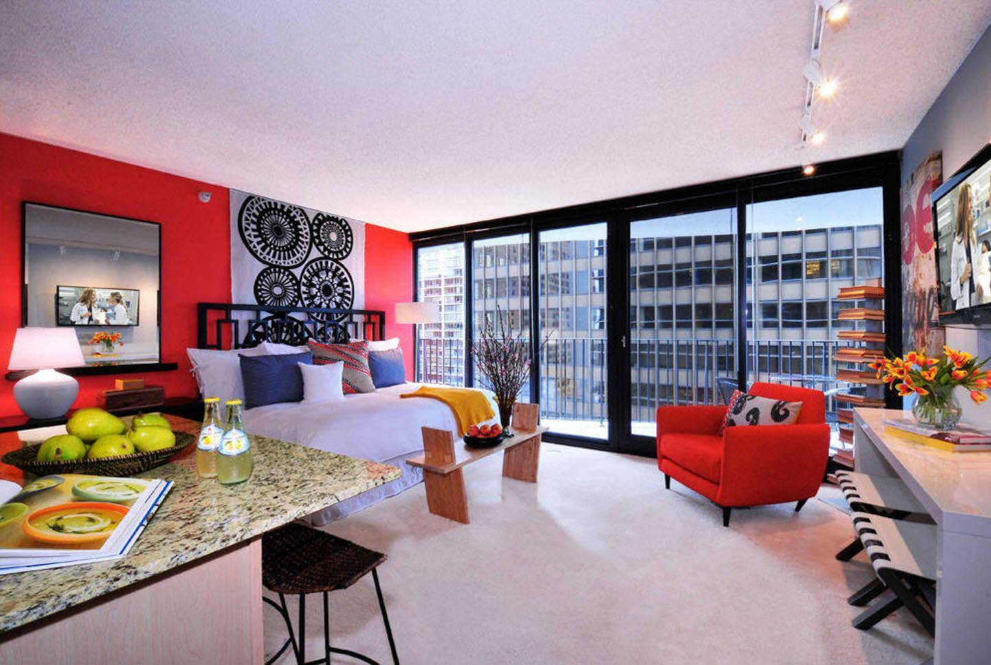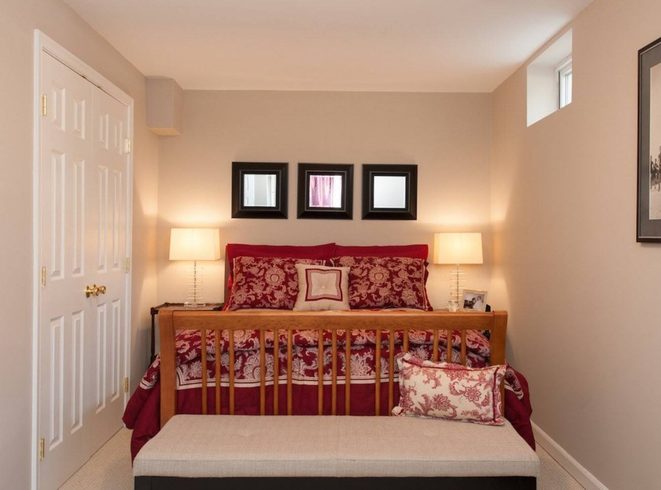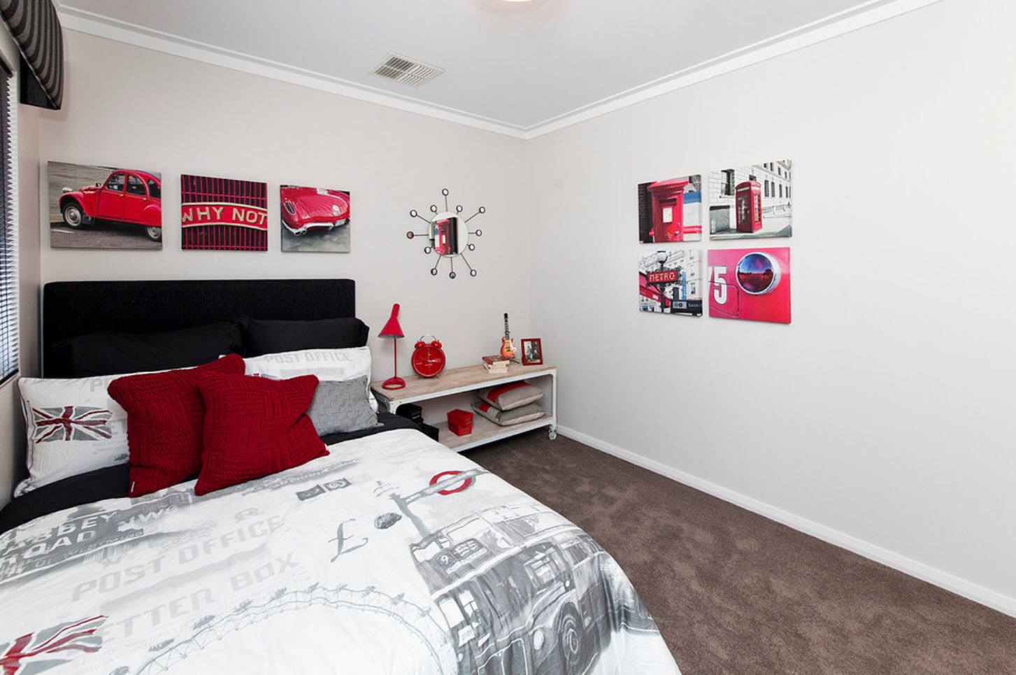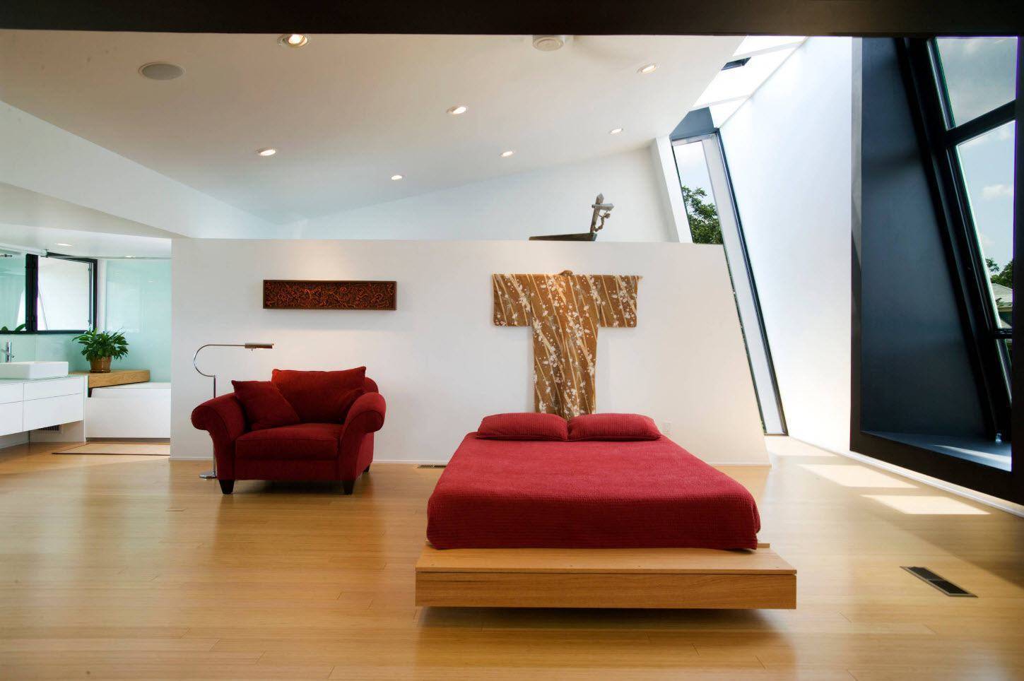 Расположение спальни отличается смесью белого, черного и красного. Все сохраняется в ярких цветах, которые были сформированы в цвете элегантного черного. Дополнительный характер интерьера украшается специально подобранным освещением. Важнейшим элементом этой части квартиры является большая удобная кровать с мягким изголовьем.