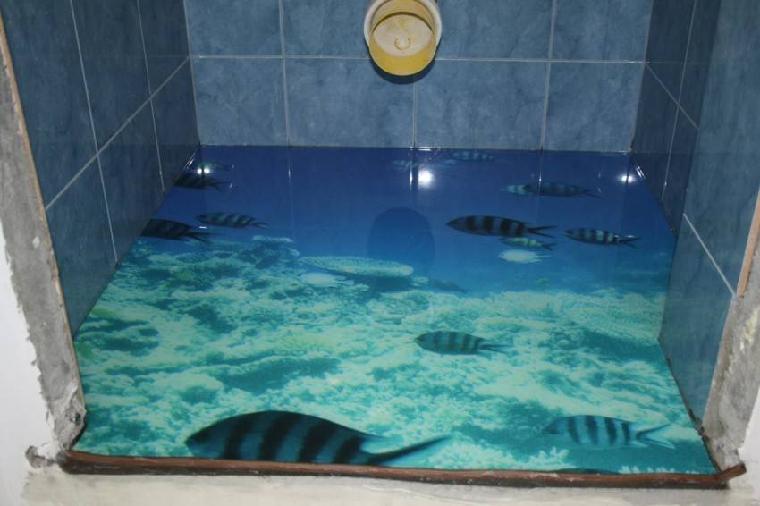 Наливной пол под ванной и на открытых пространствах смотрится идеально, и благодаря его многослойности, существует практичная возможность украсить комнату визуально объемными изображениями, с такими преимуществами: