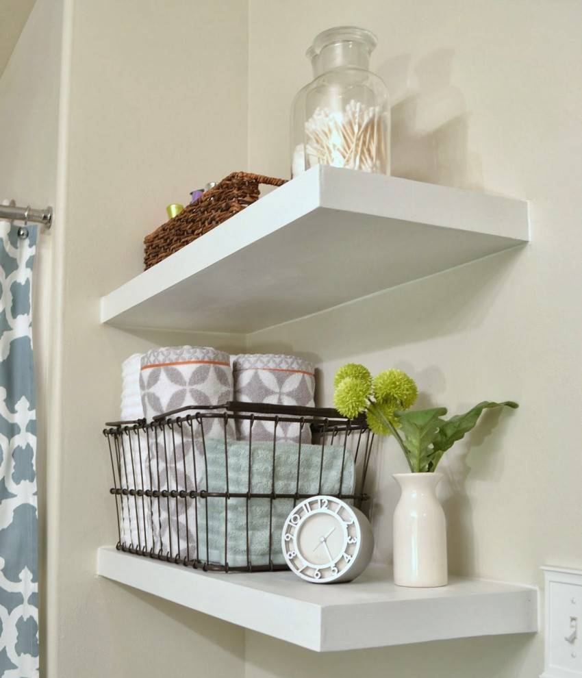 Встроенные варианты часто устанавливают в подготовленной нише над сливным бачком (хранят там туалетную бумагу и даже книги) или в стене над ванной (расставляют шампуни, гели, ароматические свечи, сложенные банные халаты).