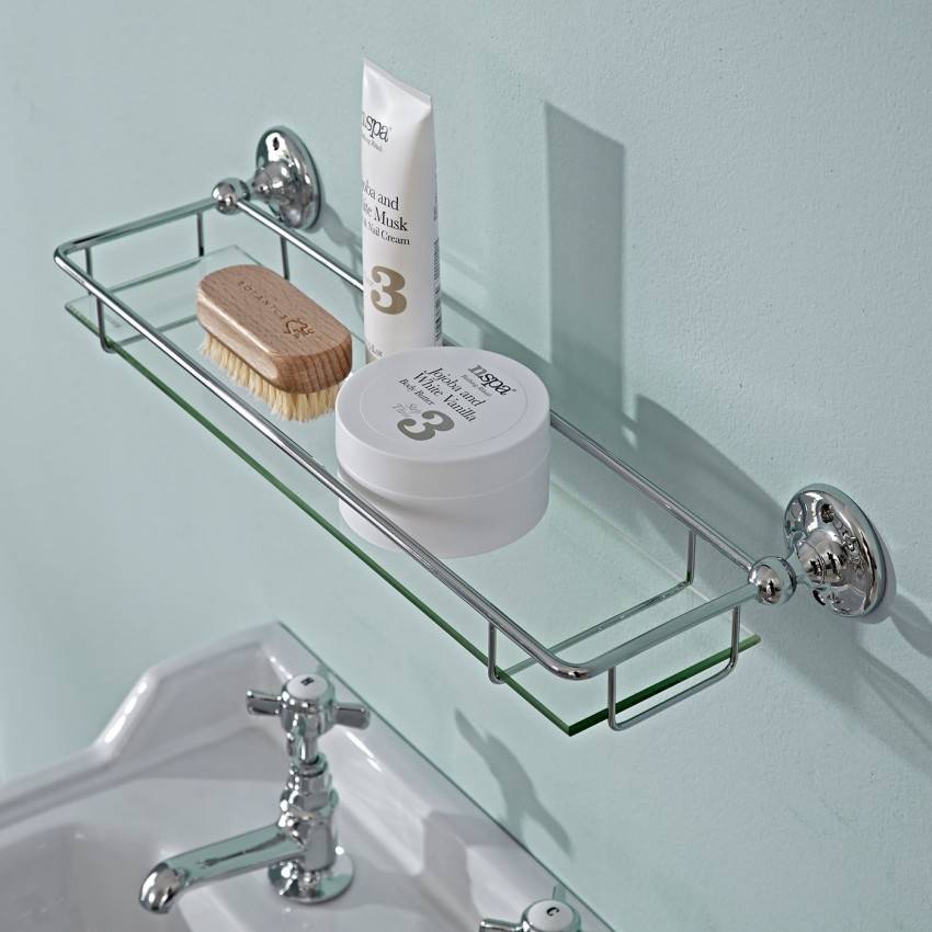 Стеклянная полочка пользуется огромным успехом и при этом она довольно практична. Стекло относится к тем материалам, которые не деформируются и не разрушаются, прекрасно переносят резкие перепады температур и влажности (что очень характерно для помещения ванной).