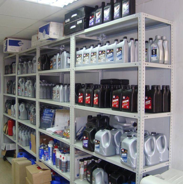 Важно предусмотреть место для жидких средств, необходимых как для автомобиля, так и для других работ. В этом случае полка может быть закрытой или иметь бортик, чтобы емкость не перевернулась и не упала с нее