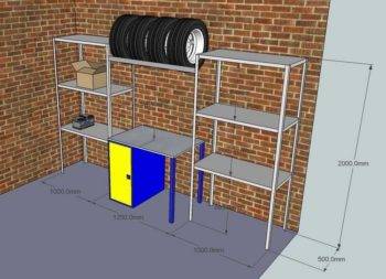 - Незначительные финансовые затраты. При сооружении ГСХ можно сэкономить деньги, воспользовавшись подручными материалами. При этом покупка готовых стеллажей даже самой простой модели ощутимо ударит по бюджету. В следующем примере для колес автомобиля предусмотрено место вдоль стены, что согласуется с узкими полками над ними.