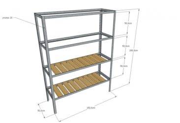 Стойки подобного стеллажа делаются из труб прямоугольного сечения или же из профиля с шириной одной из сторон 5 см. В качестве поперечин лучше всего подойдёт уголок 30 мм.