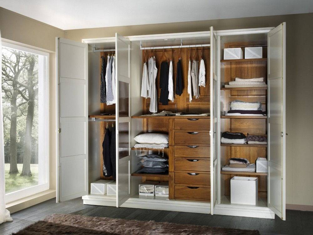 Изделия, оснащенные 3 или 4 створками желательно устанавливать в просторных помещениях. Сверху они могут оснащаться антресолями, что увеличивает их вместительность.
