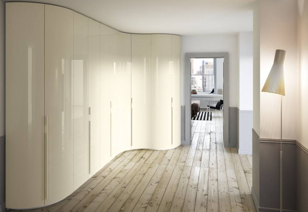 - Радиусный — оригинальный вариант с необычным дизайном. Форма может быть вогнутой или выгнутой. Такой шкаф можно вписать в угол комнаты, где он займет минимум места. Также он легко встанет в самые неподходящие для шифоньера ниши: изогнутые, маленькие, кривые. Эта особенность делает такие изделия одними из самых популярных.