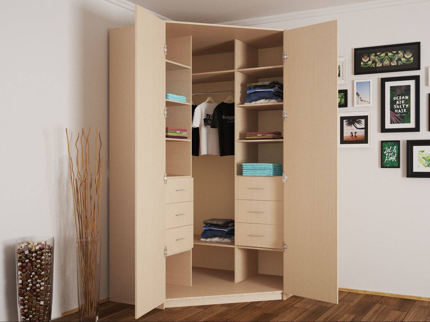 - угловую — такие модели размещаются вдоль двух смежных стен, при этом одна сторона у них больше другой (вдоль одной стены размещено 3 створки, а вдоль другой – одна). Шкафы Г образной формы в наилучшей степени выполняют функции гардеробной, а также позволяют использовать участки комнаты, которые ранее оставались невостребованными. Благодаря этому наиболее активно используемые зоны помещения остаются свободными;