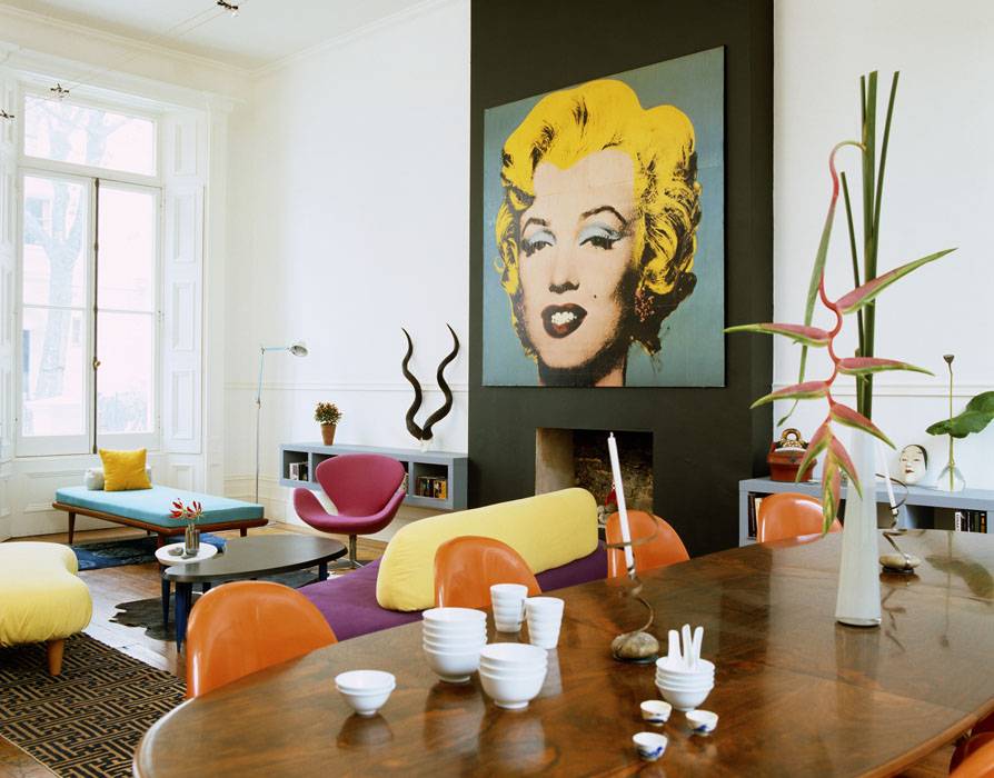 Сам портрет может быть в ярком оформлении, а повесить его можно над камином. Стены могут быть пастельных тонов или же одну стену можно выделить и сделать красочной. Возле окна поставьте дубовый овальный стол, а вокруг него яркие пластмассовые стулья, желательно разных цветов. Ближе к стене стоит поставить диван цвета индиго и украсить его яркими сочными подушками. Кстати, подушки могут быть в форме женских красных губ или в виде мордочки панды.